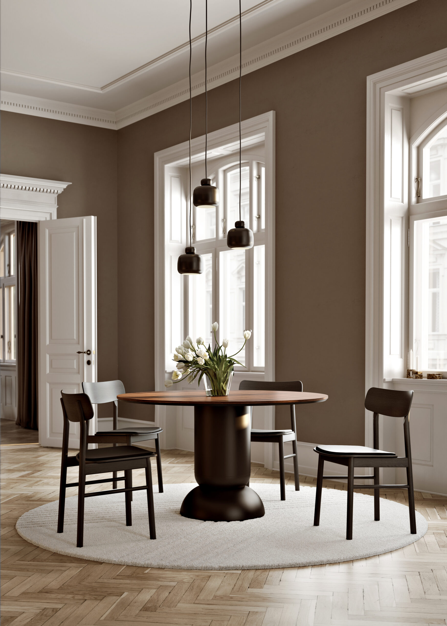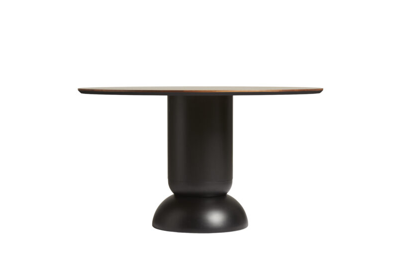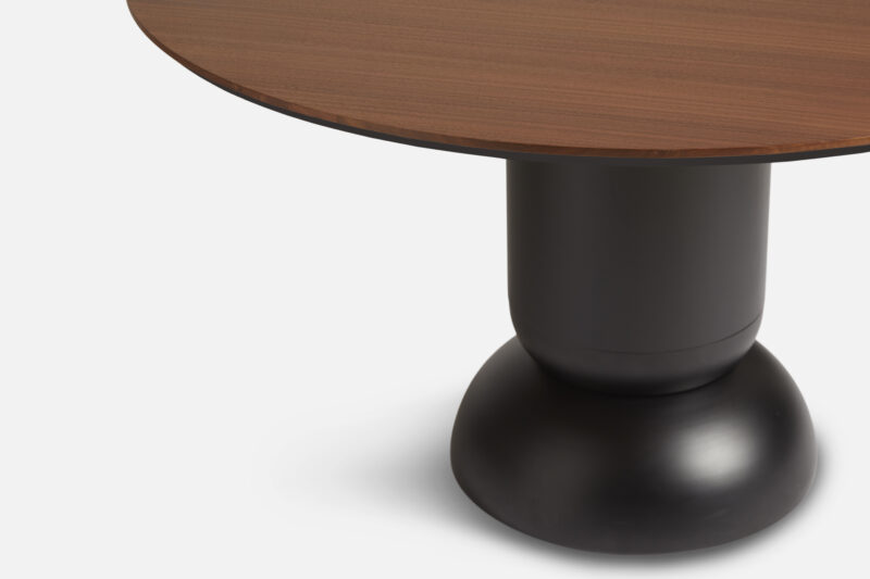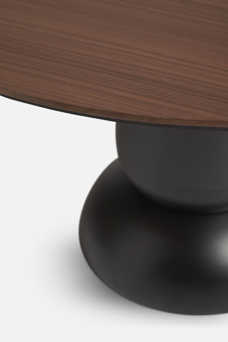 Ludo er et visuelt sterkt stolpe spisebord som legemliggjør skjønnheten i enkelhet og balanse. Inspirert av rene geometriske former, konvergerer dens konvekse og konkave former harmonisk i en sokkelbase. Viser et kunstnerisk utseende. Med sin runde topp av tre og sentrert base gir Ludo god benplass og enkel overnatting for ekstra gjester.