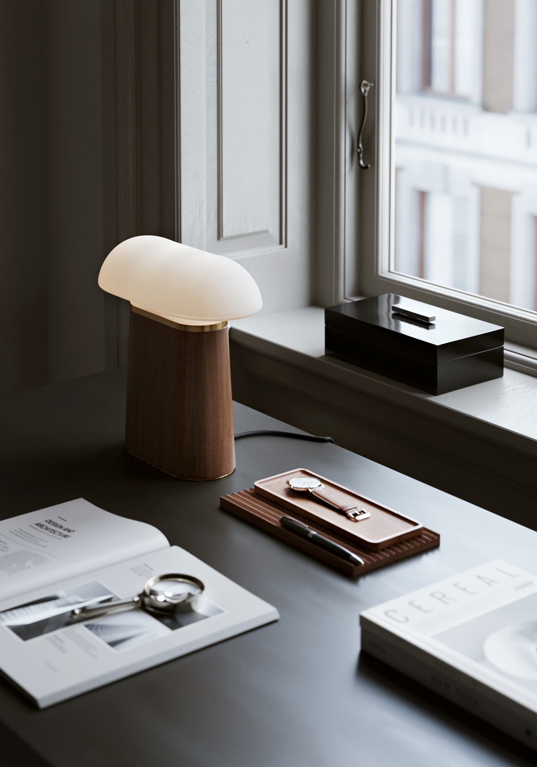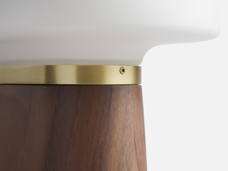 Nova er en dekorativ og skulpturell bordlampe. Den avrundede, luftige glassskjermen flyter sømløst inn i en solid, raffinert kjerne som utvider seg mot basen. Balanserer estetikken til delikat glass med naturlige, robuste materialer. Det slanke messingelementet forbinder elegant skyggen og basen til en visuelt velproporsjonert symfoni.